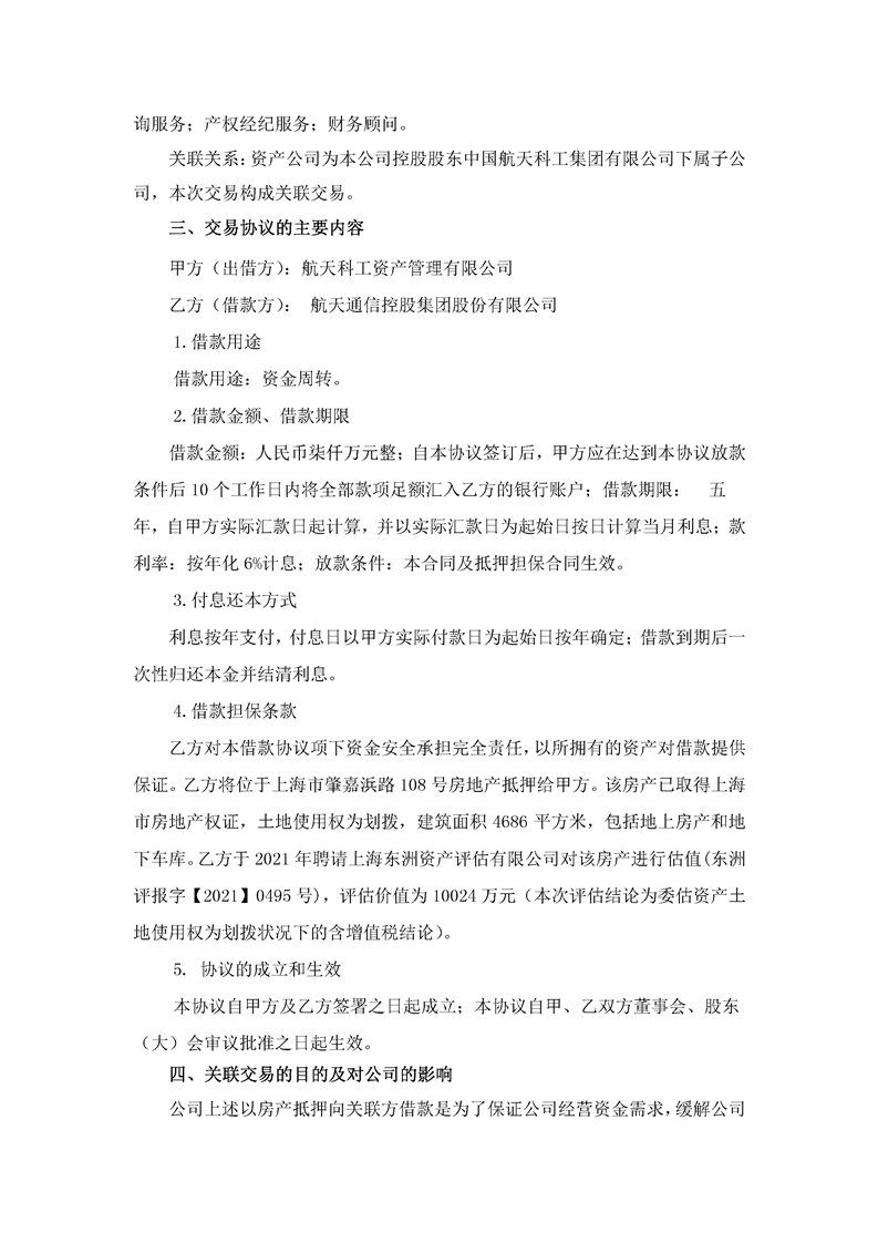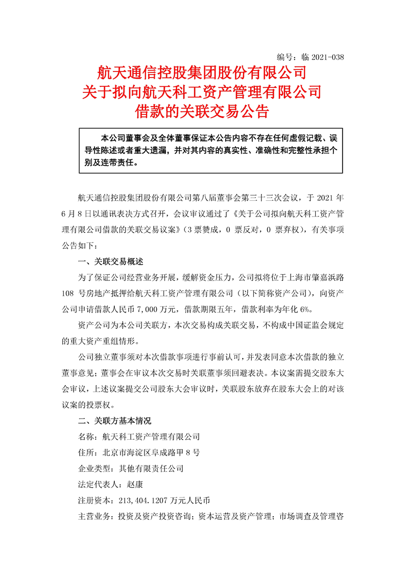 航天通信控股集團(tuán)股份有限公司關(guān)于擬向航天科工資產(chǎn)管理有限公司借款的關(guān)聯(lián)交易公告