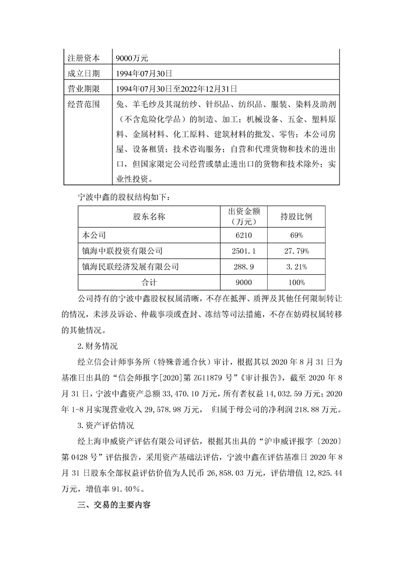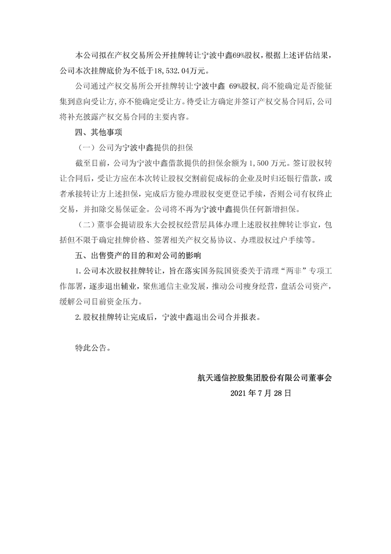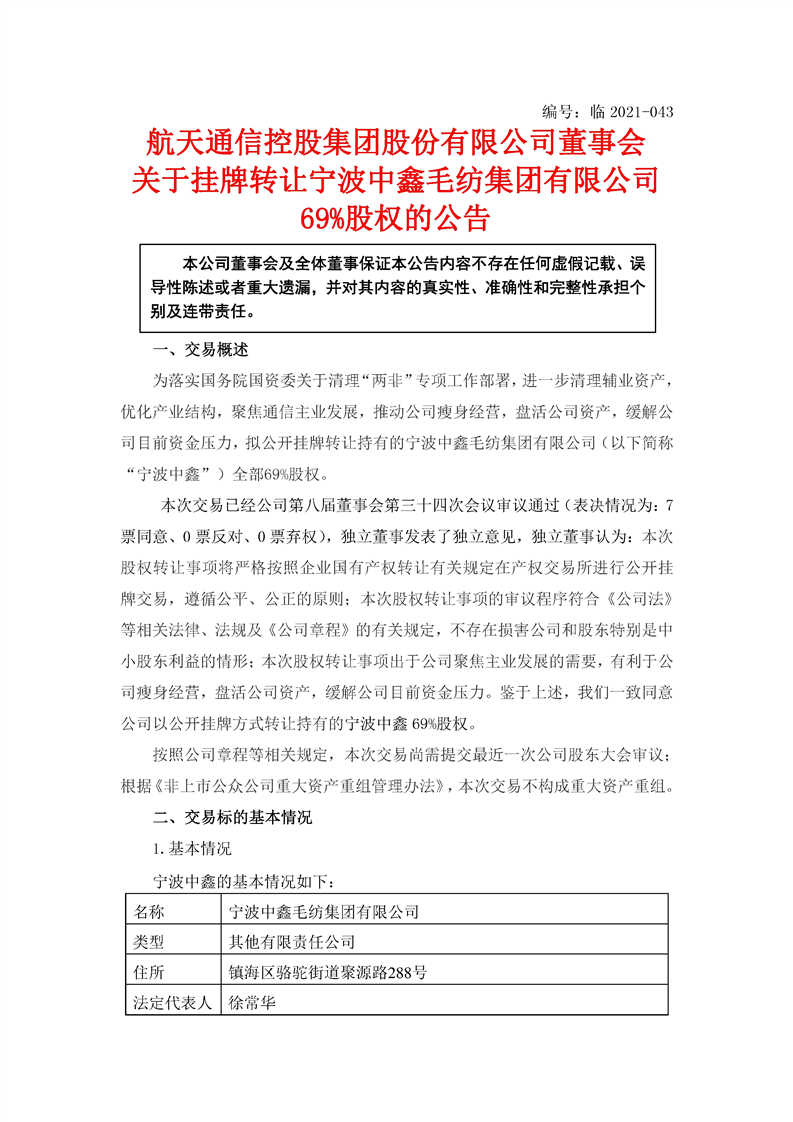 航天通信控股集團股份有限公司關于掛牌轉讓寧波中鑫毛紡集團有限公司69%股權的公告